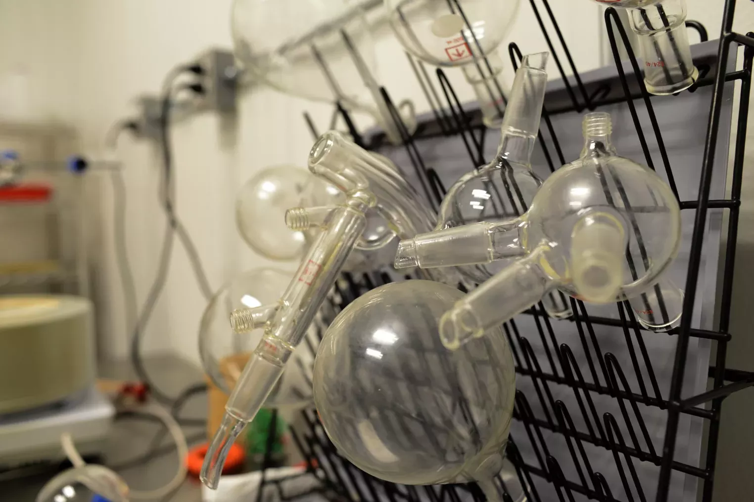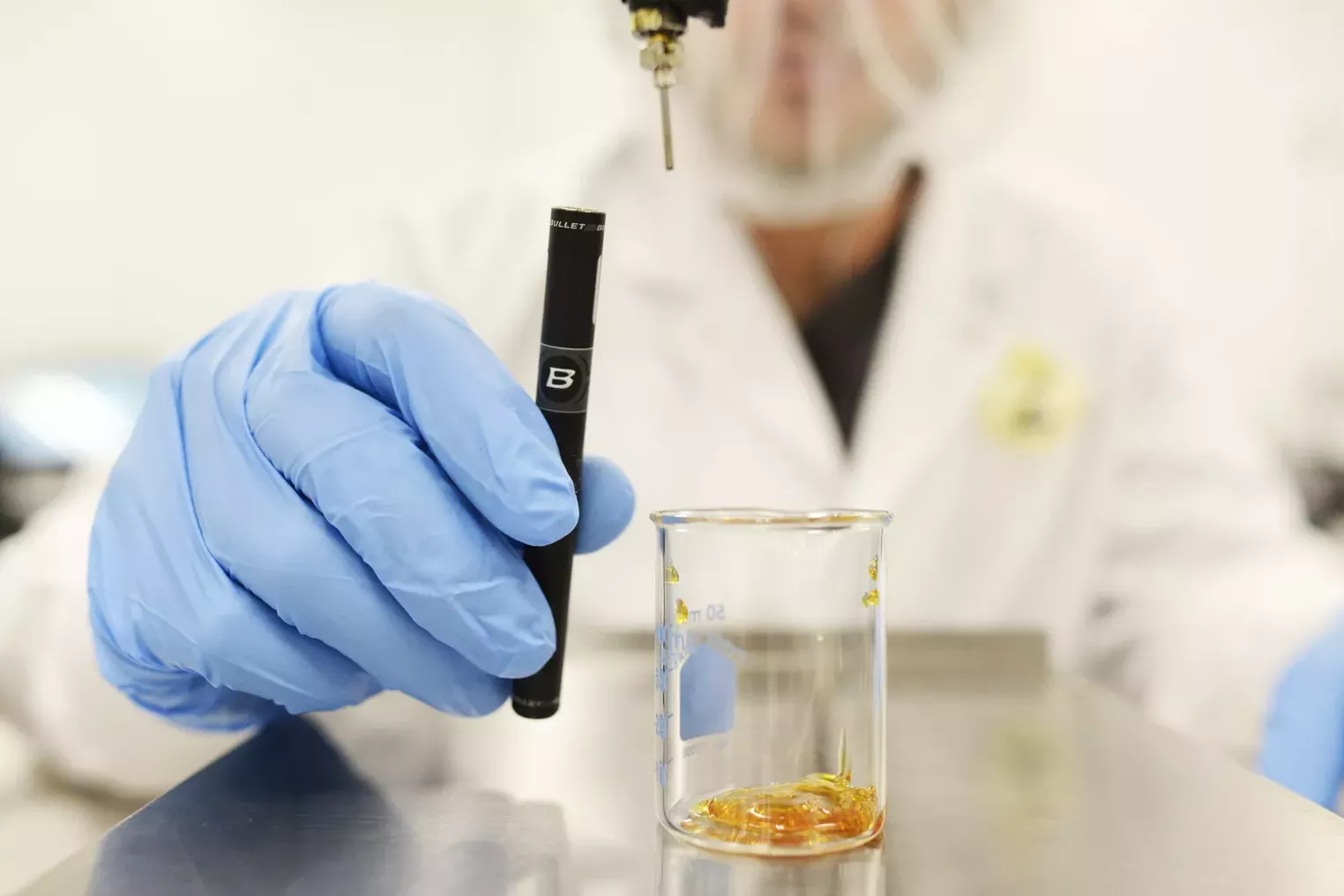 Hash oil is poured into a beaker as vaporizer cartridges are about to get filled.